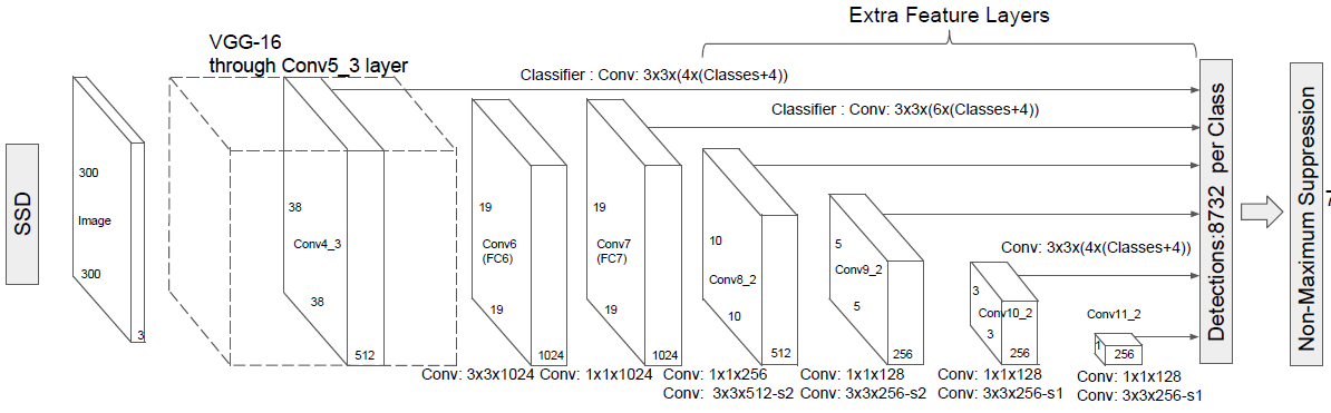 Convolutional Layer 이후에 나오는 Feature map마다 Bounding Box의 Class 점수와 좌표를 구하고, NMS 알고리즘을 통해 최종 Bounding Box를 결정한다. 이는 각 Feature map마다 스케일이 다르기 때문에 작은 물체와 큰 물체를 모두 탐지할 수 있다는 장점이 있다.