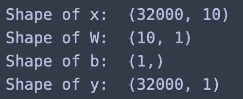 Weight값은 X값의 shape에 맞게, (10,1)로 행렬의 곱을 할 수 있도록, 할당되었다.