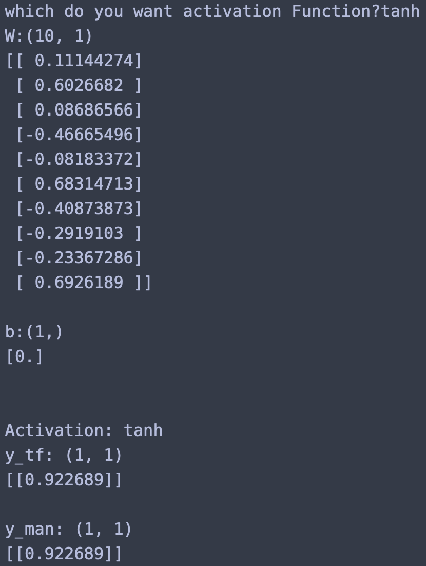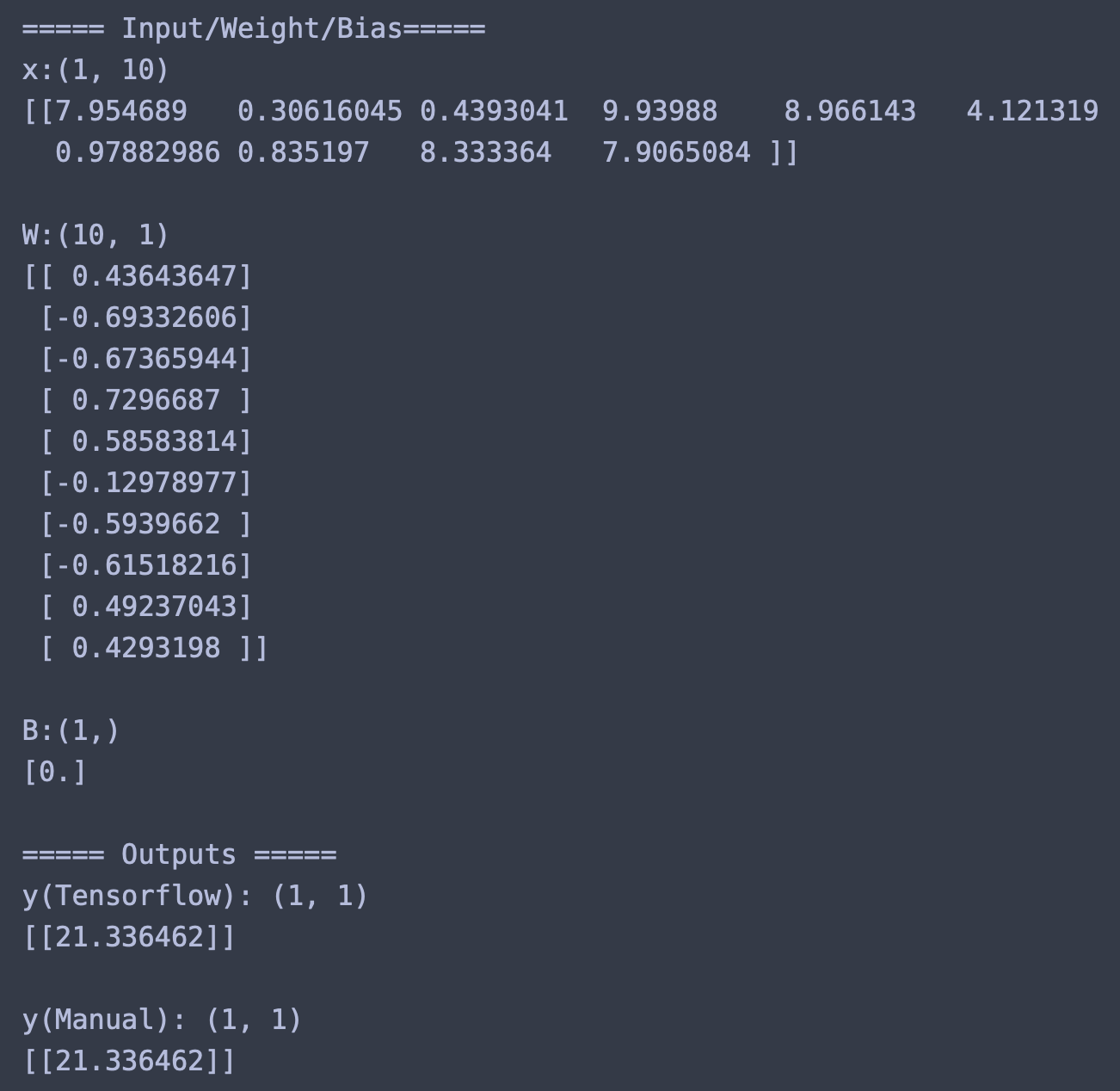 그 결과, y(tensorflow) 와 y(menual)값은 shape과 값 모두 동일함을 알 수 있다.