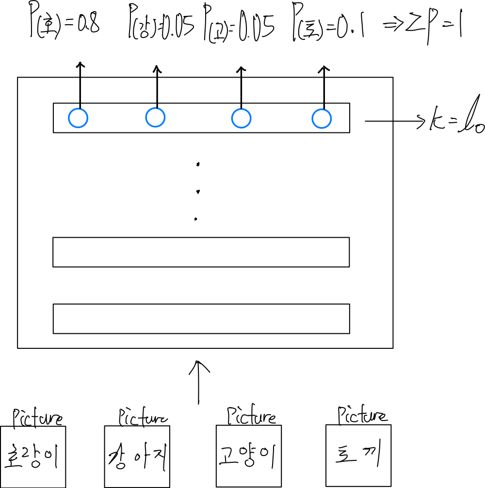 - Softmax 이전 layer의 neuron 개수는 logit 값의 개수와 동일하고, softmax layer의 출력값인 provability의 개수와 동일하다.