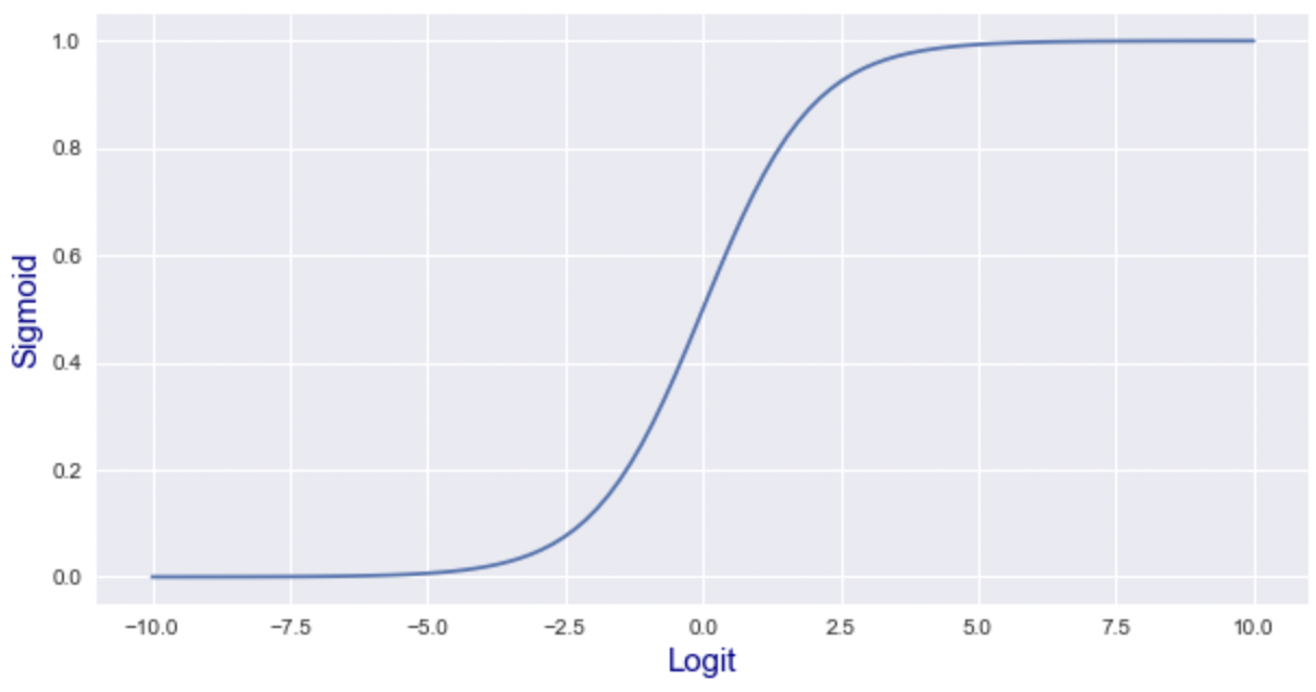 sigmoid 그래프 결과는 아래와 같다.(Logit값이 음의 무한으로 가면, sigmoid값은 0에 수렴하고, Logit값이 양의 무한으로 가면, sigmoid값은 1에 수렴한다.)