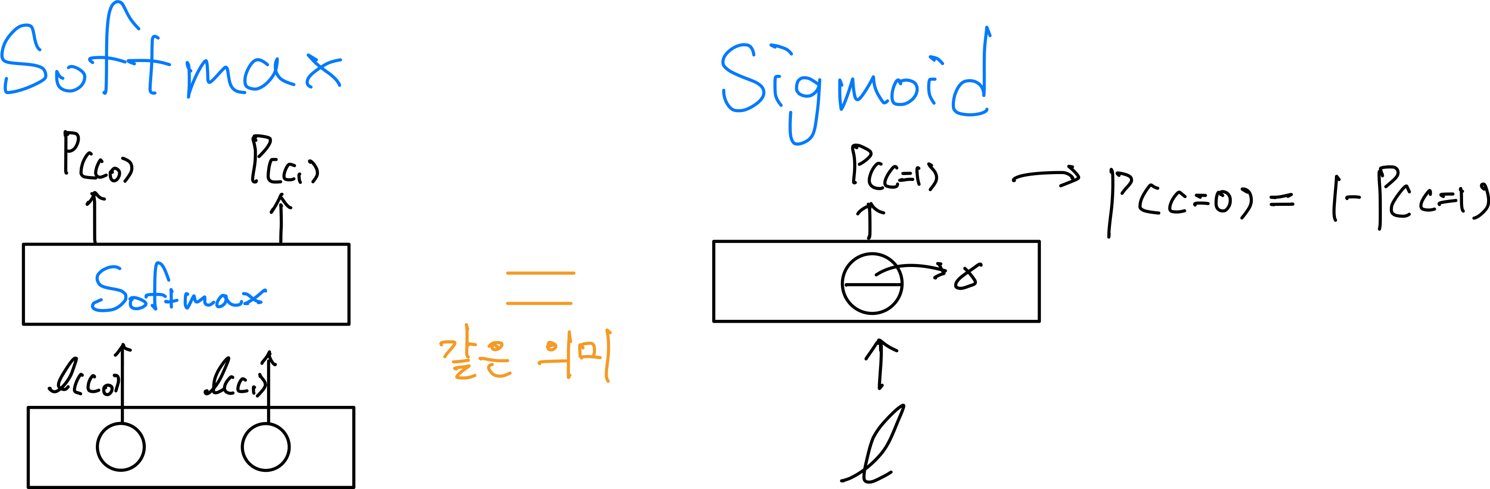 - Softmax는 logit vector를 받아서 provability vector를 추출하고, Sigmoid는 logit 1개를 받아서 provability 1개를 추출한다.
