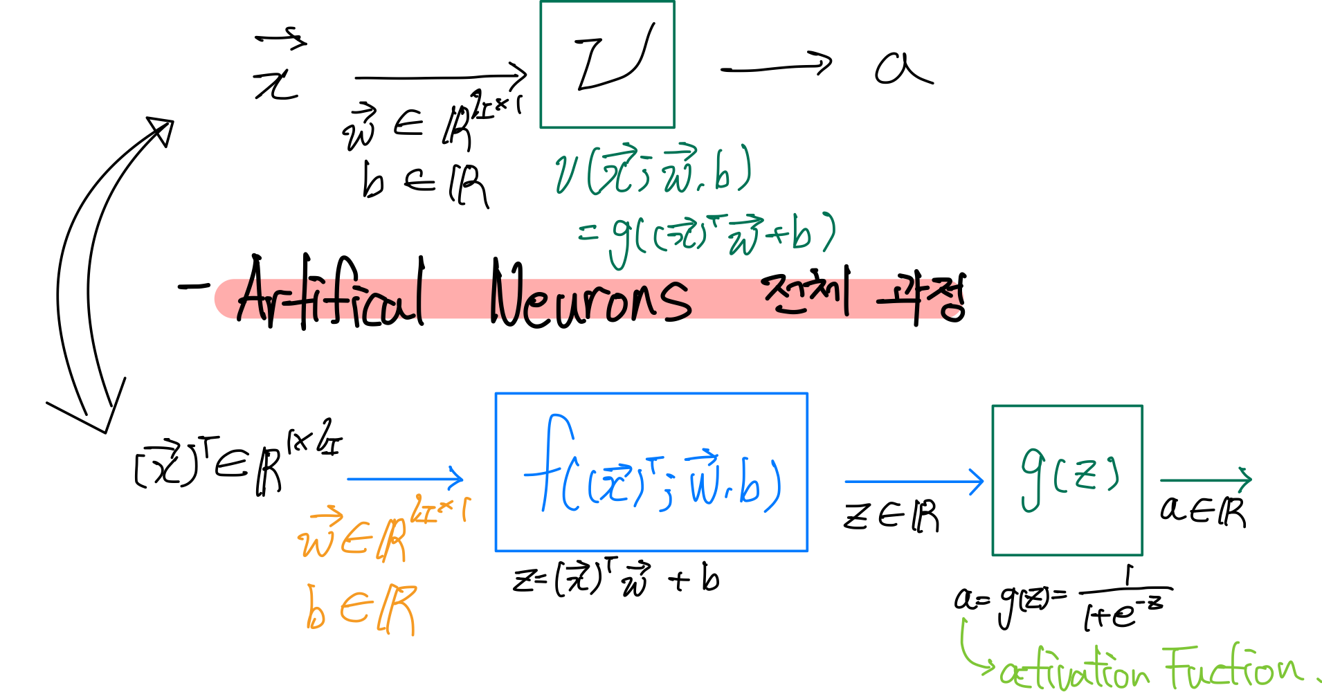저번 게시글에서 배운 Artificial Neurons이 실제로 어떻게 구현이 되는지 파이썬을 통해 구현해보자. Artificial Neurons는 Affine Funtion 과 Activation Funtion으로 이루어져있다고 했다. Affine Funtion 과 Activation Funtion을 먼저 구현해보고 Artificial Neurons를 진행해보겠다. 가장 중요하게 봐야할 것은 분석되는 과정에서 데이터의 차원, weight의 차원, bias의 차원을 확인해야한다. 왜냐하면, 나중에 거대한 데이터를 다룰 때, 모델이 잘 구동되고 있는지는 shape로 밖에 확인할 수 없기 때문이다. Affine Function Artificial Neurons를 구현할 때, Affine Function은 w..